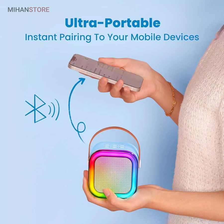 اسپیکر بلوتوثی میکروفن دار قابل حمل یک اسپیکر قابل حمل با قابلیت اتصال بلوتوث، USB و کارت حافظه است. این اسپیکر همچنین دارای یک میکروفون بی سیم است که برای سخنرانی، آواز خواندن و ضبط صدا مناسب است.با استفاده از میکروفون افکت دار بر روی صدای خود تغییرات ایجاد کنید و لحظات خوش و بامزه با همراهان خود ایجاد کنید.این اسپیکر مناسب برای استفاده در منازل، اتاق‌های کار، فضاهای آموزشی و حتی در فضاهای باز می‌باشد. با طراحی مدرن و جمع و جور، این اسپیکر به هر مکانی ستایش می‌آورد و جلوه‌ی منحصر به فردی به آن می‌بخشد.مناسب برای گوش دادن به موسیقی، تماشای فیلم با کیفیت صدای عالی. با اسپیکر بلوتوثی میکروفن دار قابل حمل، تجربه‌ای جدید از گوش دادن به موسیقی را تجربه کنید.